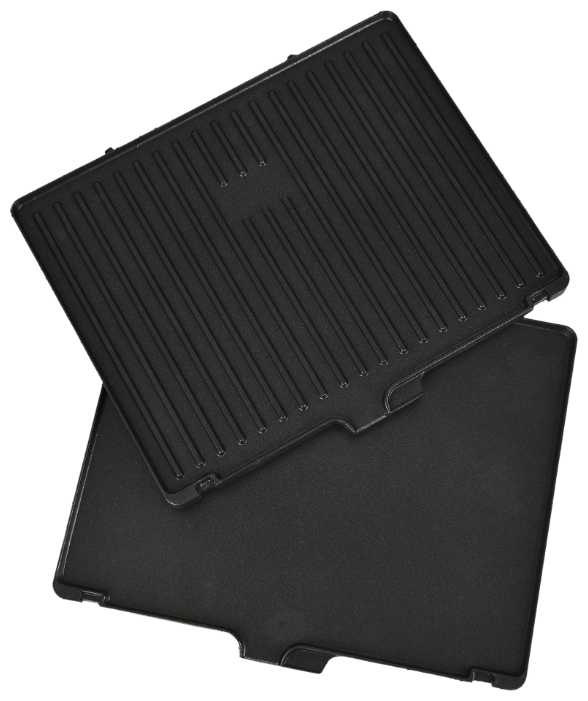 - Двусторонний дизайн (рифленая сторона для гриля и гладкая для сковороды) позволяет готовить разнообразные блюда, от стейков до яичницы, без пригорания.