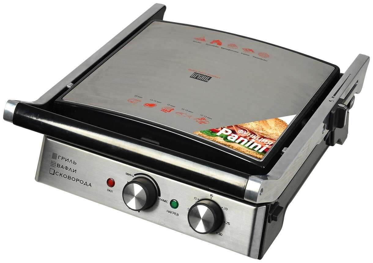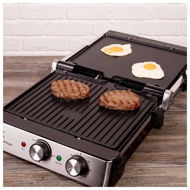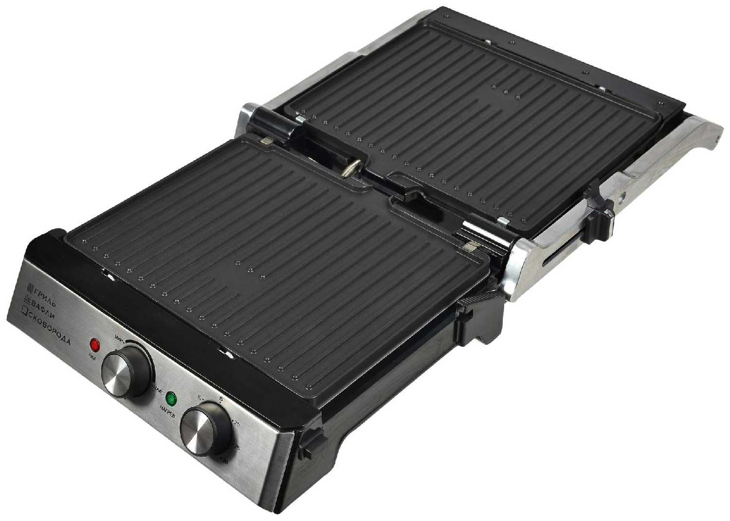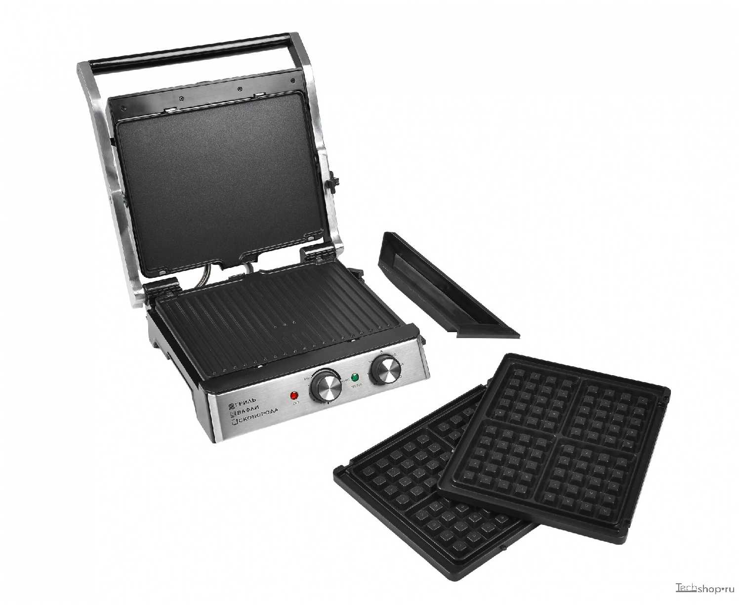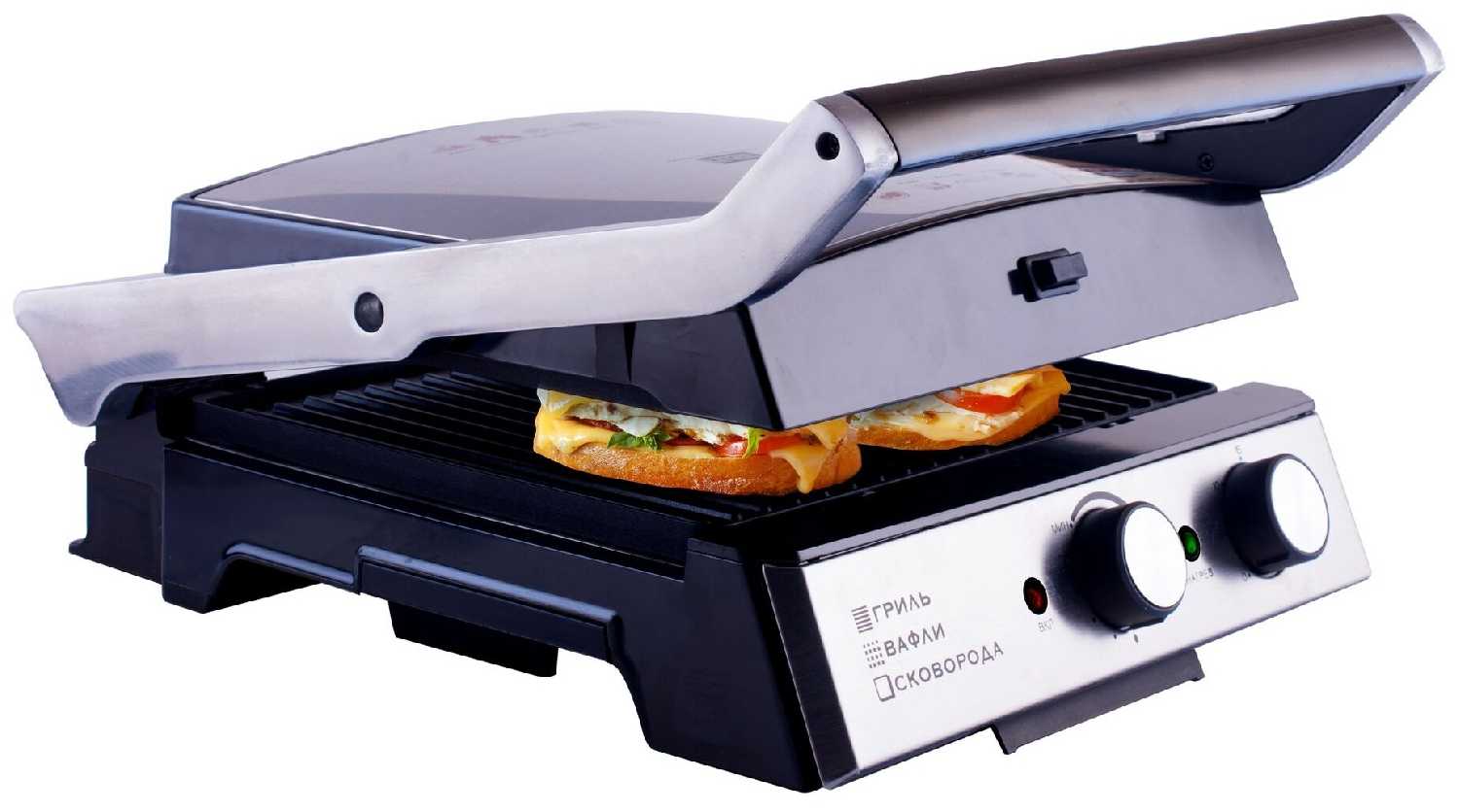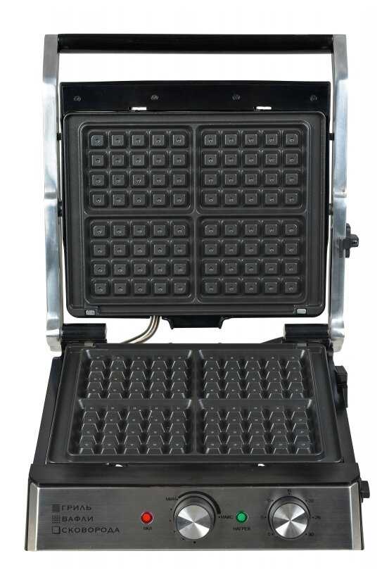 - Мощность обеспечивает равномерную прожарку стейков, овощей и вафель без «эффекта варки».