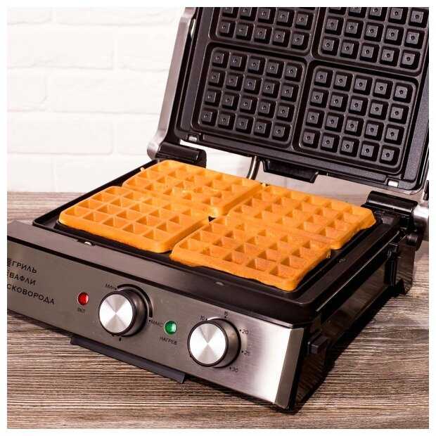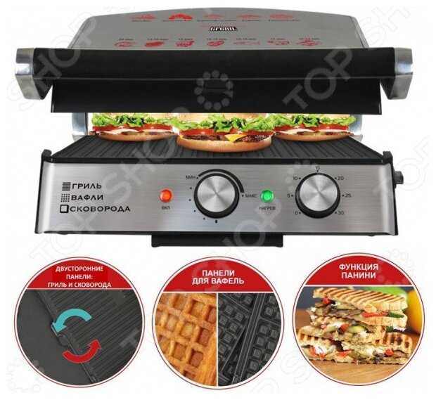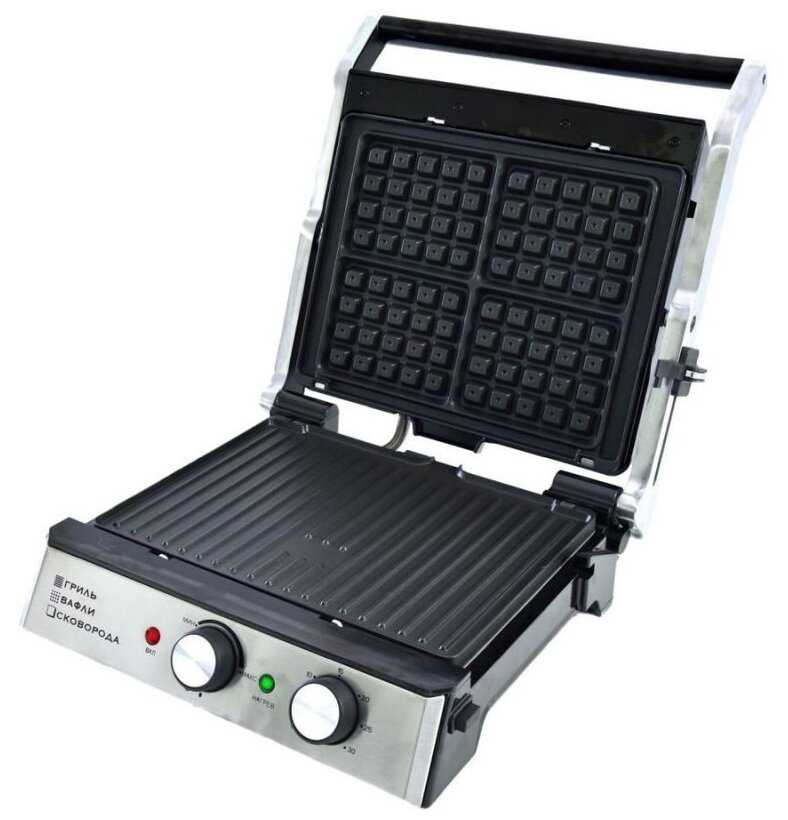 - В комплекте три типа панелей: гриль, сковорода, вафельница (4 секции).