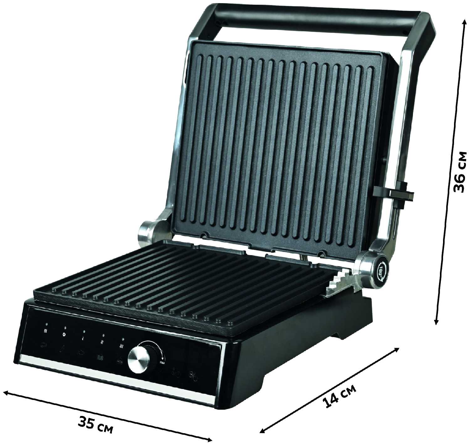 - Возможность использовать как контактный гриль (закрытый режим) и как барбекю-платформу при раскладывании на 180°.
