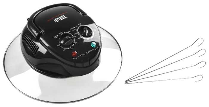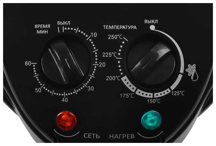 - Механические регуляторы времени (до 60 минут) и температуры (до 250°C) с чёткими отметками.