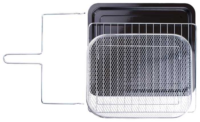 | Комплектация : | вертел, решётка, противень, поддон для сбора крошек, держатель для противня/решётки |