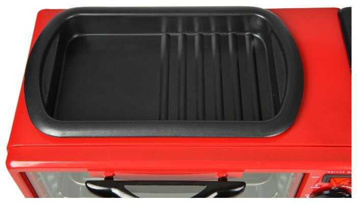 - Несмотря на малые габариты, устройство объединяет три прибора: духовой шкаф с равномерным нагревом, антипригарную сковороду-гриль и кофеварку с ёмкостью на 2 чашки.