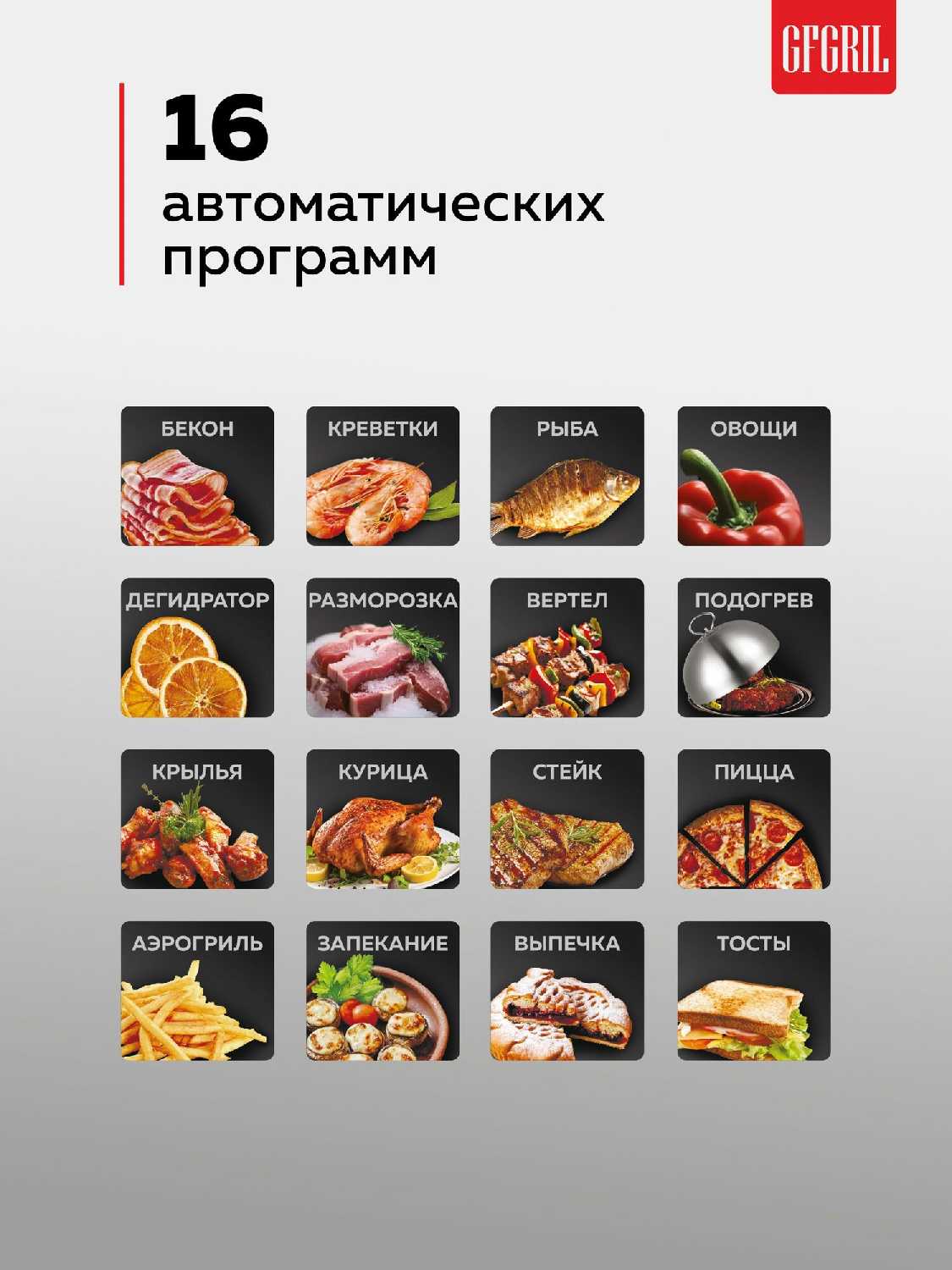 | Режимы работы : | верхний нагрев, верхний+нижний нагрев, конвекция, нижний нагрев, размораживание |