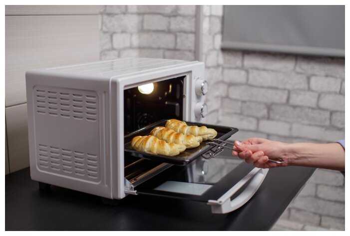 Данная мини-печь понравилась при выборе своим дизайном и функционалом. Производитель был до этой покупки неизвестен. Упакована в очень прочную и надежную коробку, инструкция на русском языке небольшая есть. В комплекте противень, решетка и удобный держатель - все было на месте и хорошо упаковано. При выполнении рекомендуемого прогрева на максимальной температуре никакого дыма и запахов не было. Пользуемся со дня покупки уже месяц ежедневно. Нравится дизайн. Радует подсветка - лампочка большая с левой стороны камеры. Удобно пользоваться дверцей, которая фиксируется в нескольких положениях. Регуляторы перемещаются легко и плавно. Регулятор температуры от 100 до 250 градусов. Таймер от 5 до 60 минут. Есть яркая красная сигнальная лампа, которая горит когда установлено время приготовления. Звуковой сигнал об окончании цикла громкий. Высокие устойчивые ножки. Во время работы печь нагревается очень сильно, горячим становится даже поверхность стола перед и под ней. Устанавливать необходимо отдельно и подальше от других предметов. При работе верхнего нагрева ручка дверцы тоже очень сильно разогревается. Попробовали все режимы. Какой режим в каком случае включать на практике очень быстро понимаешь. В целом работой печи довольны.