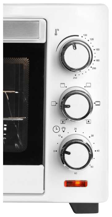 Данная мини-печь понравилась при выборе своим дизайном и функционалом. Производитель был до этой покупки неизвестен. Упакована в очень прочную и надежную коробку, инструкция на русском языке небольшая есть. В комплекте противень, решетка и удобный держатель - все было на месте и хорошо упаковано. При выполнении рекомендуемого прогрева на максимальной температуре никакого дыма и запахов не было. Пользуемся со дня покупки уже месяц ежедневно. Нравится дизайн. Радует подсветка - лампочка большая с левой стороны камеры. Удобно пользоваться дверцей, которая фиксируется в нескольких положениях. Регуляторы перемещаются легко и плавно. Регулятор температуры от 100 до 250 градусов. Таймер от 5 до 60 минут. Есть яркая красная сигнальная лампа, которая горит когда установлено время приготовления. Звуковой сигнал об окончании цикла громкий. Высокие устойчивые ножки. Во время работы печь нагревается очень сильно, горячим становится даже поверхность стола перед и под ней. Устанавливать необходимо отдельно и подальше от других предметов. При работе верхнего нагрева ручка дверцы тоже очень сильно разогревается. Попробовали все режимы. Какой режим в каком случае включать на практике очень быстро понимаешь. В целом работой печи довольны.