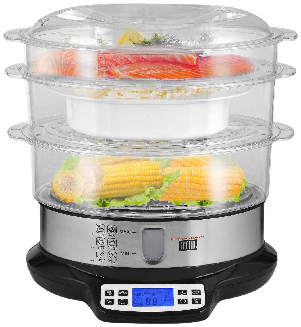 Быстро, три уровня, легко мыть, удобные таймеры, есть рисоварка. Компактная, легко хранить.
