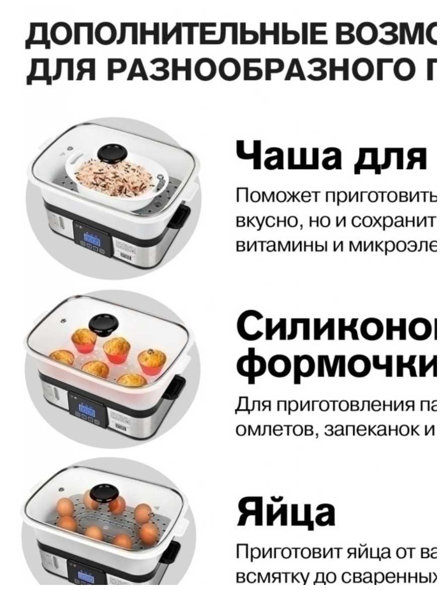 - Мощность пароварки обеспечивает быстрое нагревание воды и равномерное распределение пара, что сокращает время приготовления. Например, овощи готовятся за 15–18 минут вместо стандартных 30+.