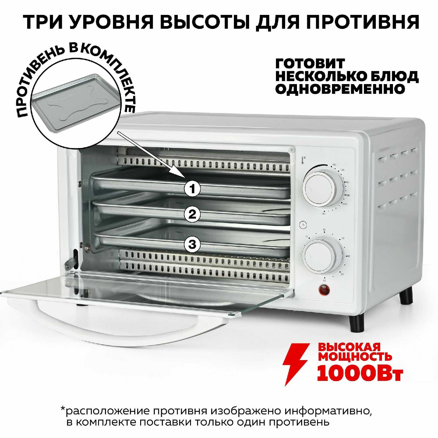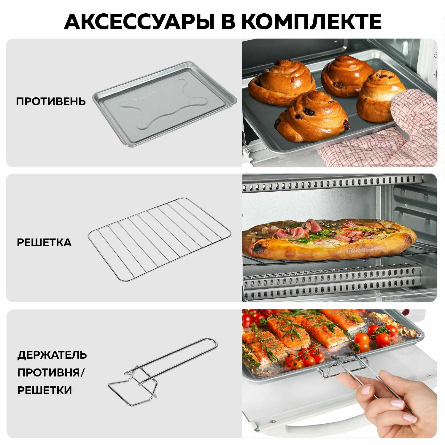 Стандартная комплектация включает противень и решетку для размещения на разных уровнях. Некоторые пользователи отмечают отсутствие держателя для противня в комплекте, что может создавать неудобства при извлечении горячих поверхностей. Бортики на противнях невысокие, что требует аккуратности при приготовлении сочных блюд во избежание вытекания сока. -