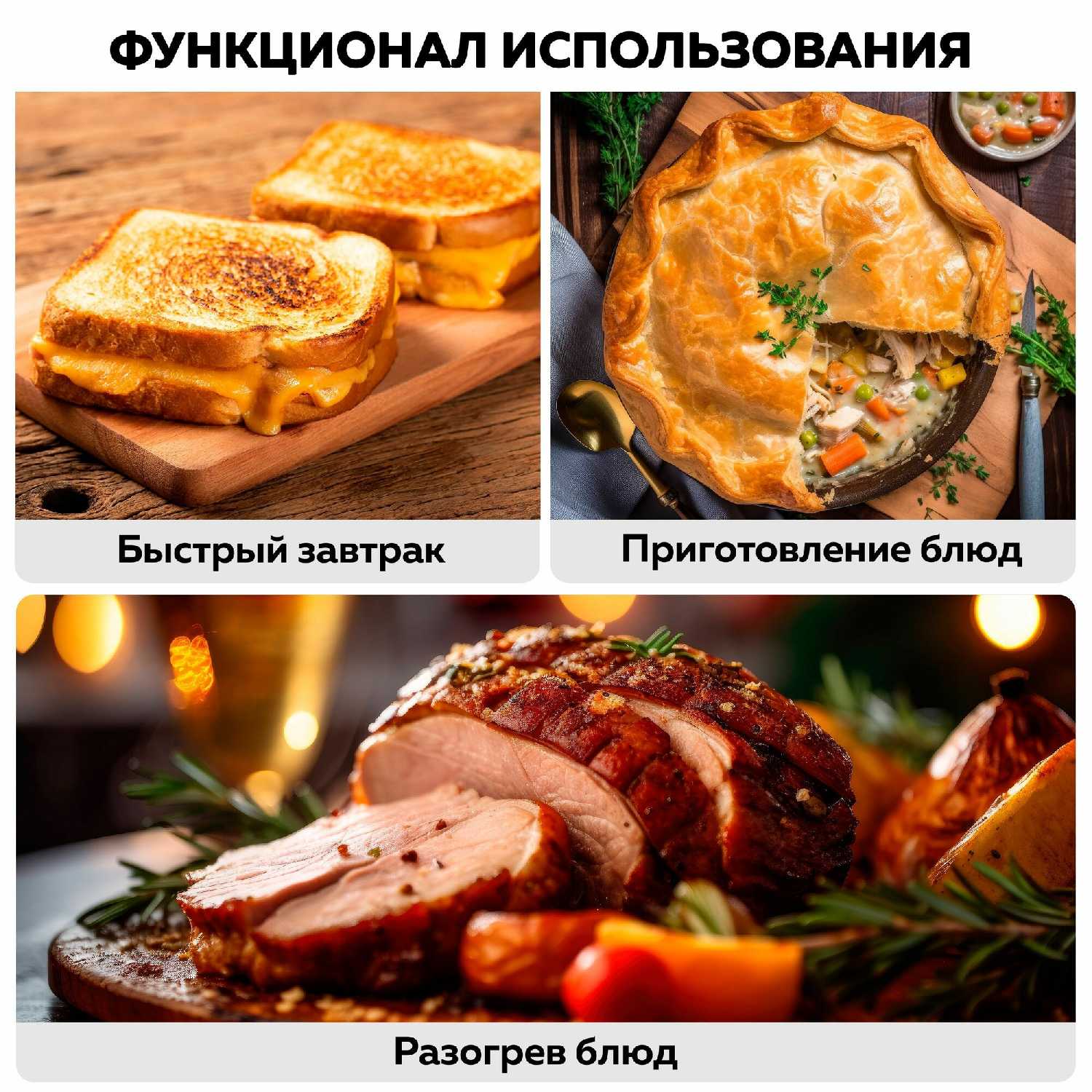 - Подходит для выпечки, запекания, разогрева и тостов, заменяя микроволновку и духовку в компактном формате.
