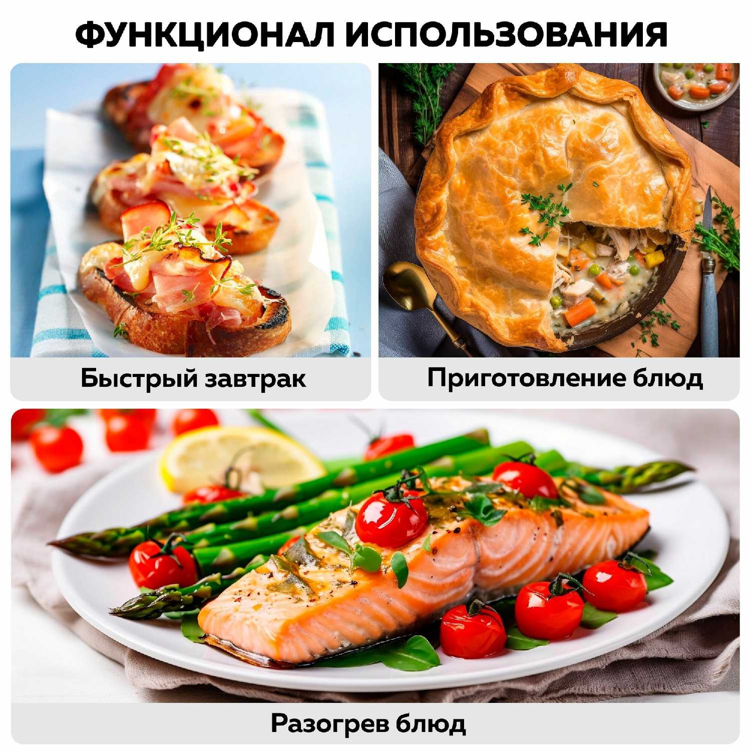Устройство успешно выполняет функции духового шкафа для выпечки и запекания, заменяет тостер для подрумянивания хлебобулочных изделий и может использоваться для разогрева пищи вместо микроволновой печи. Пользователи отмечают, что разогрев в мини-печи сохраняет текстуру продуктов лучше compared с СВЧ-печами, особенно для хлеба и выпечки. -