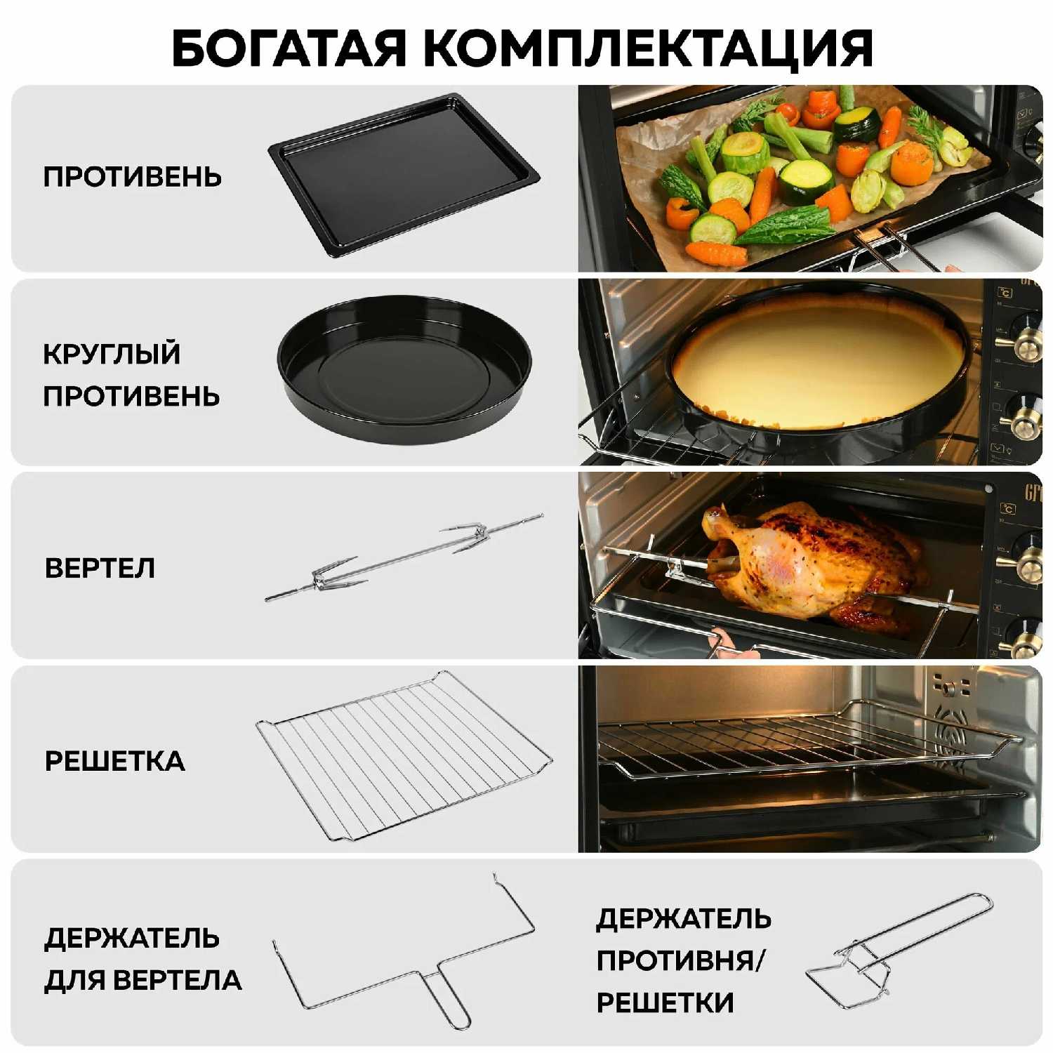 | В комплекте : | вертел, держатель для противня/решётки, противень, решётка, ухват |