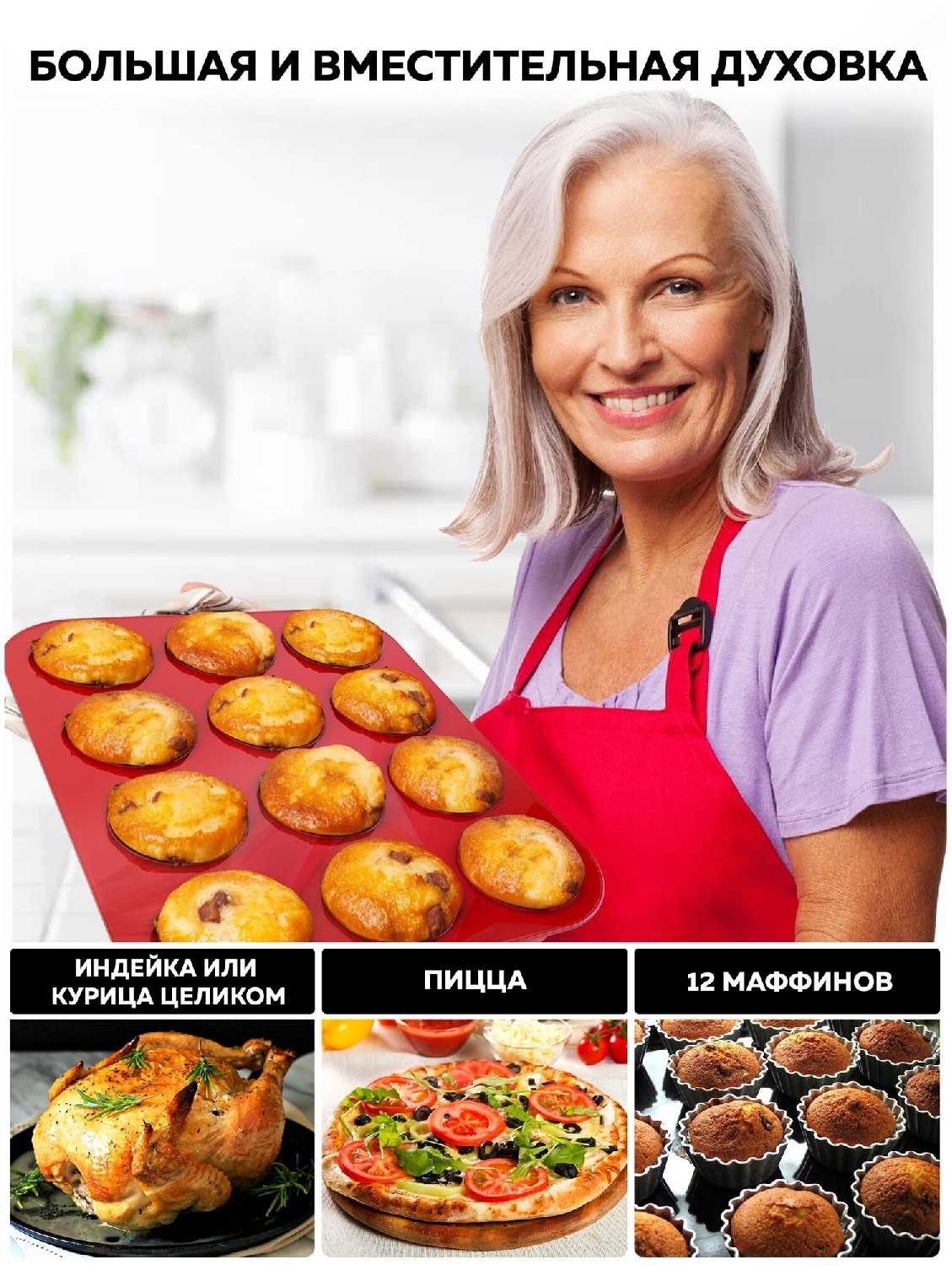 - Равномерное распределение тепла способствует формированию румяной корочки на выпечке и мясных изделиях.