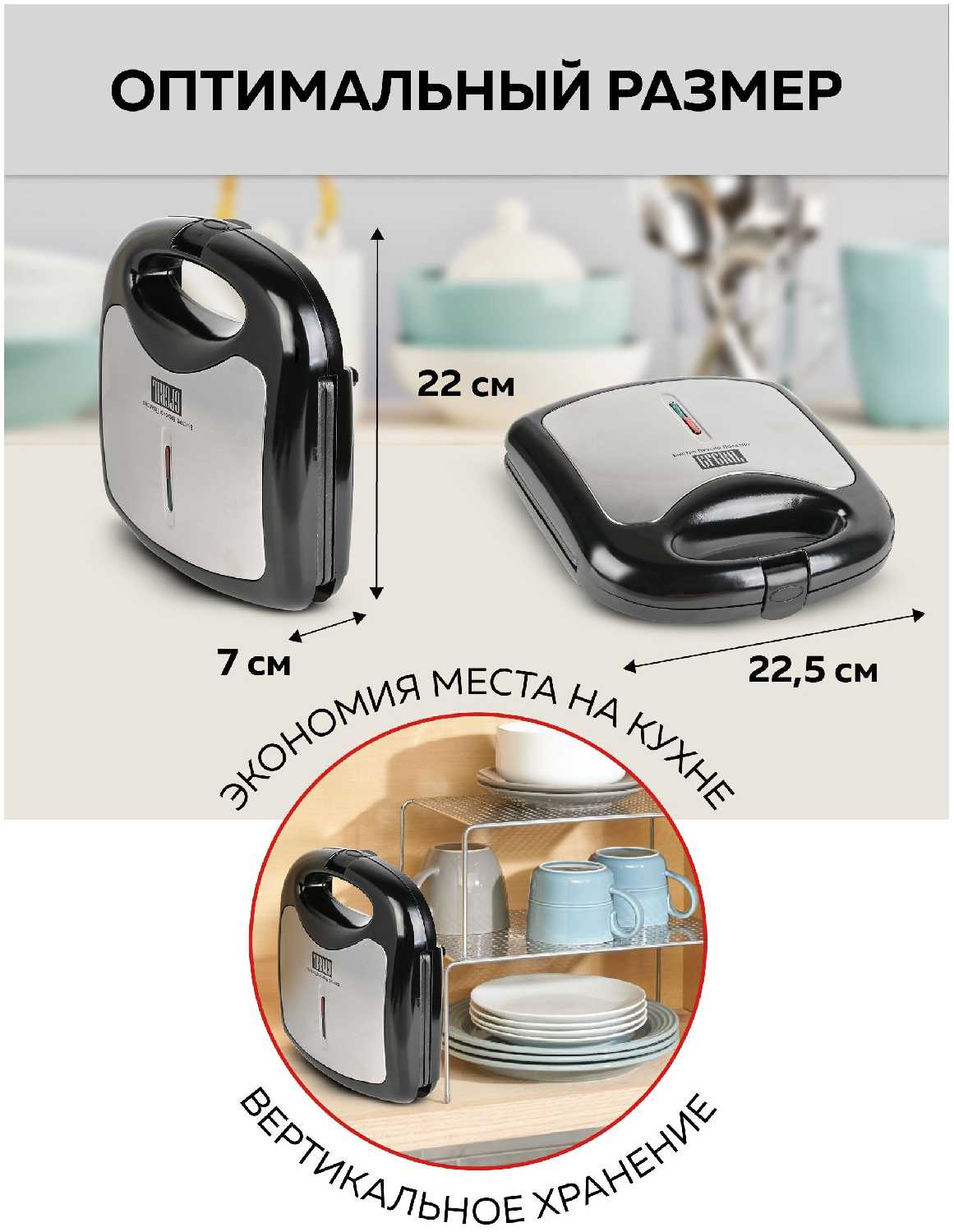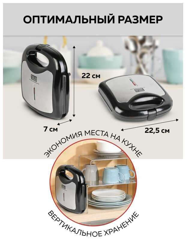 Диаметр устройства составляет всего 11,5-12 см — оно легко помещается в ладони. Благодаря фиксирующей застёжке вафельницу можно хранить вертикально, что существенно экономит место на кухне. Многие отмечают, что её удобно брать в поездки или хранить в маленьких шкафчиках.