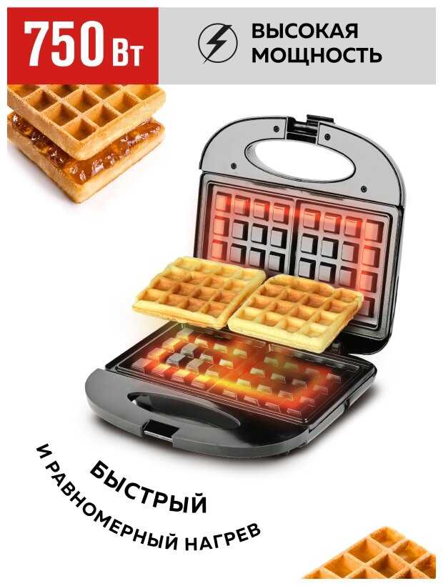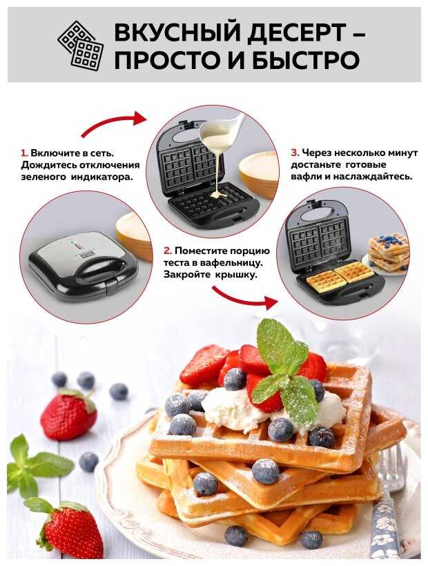- Время выпекания одной вафли — 3-5 минут. Мощности достаточно для равномерного прогрева обеих панелей.