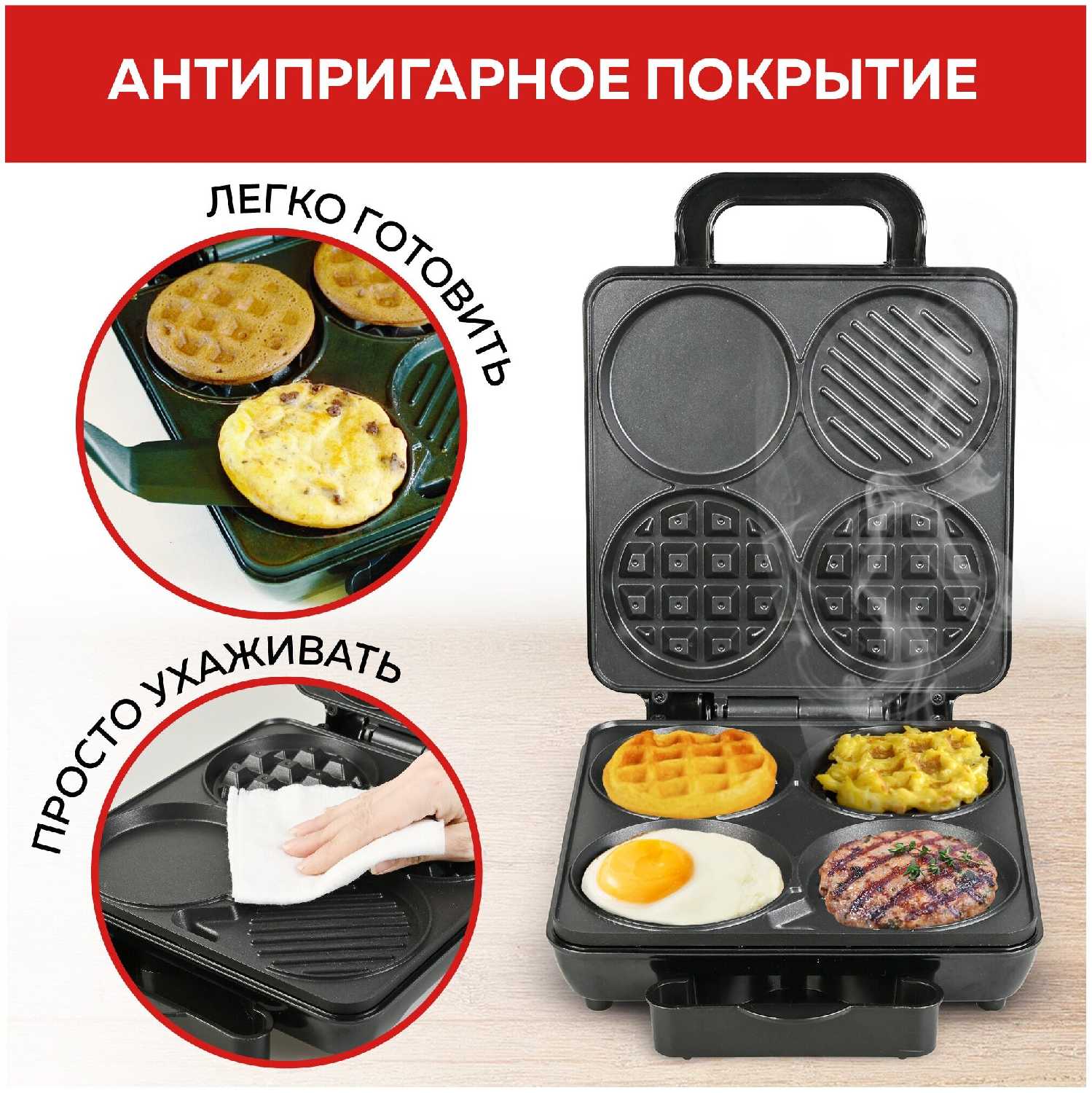 - Возможность одновременно готовить вафли, яичницу, котлеты и овощи благодаря четырём независимым секциям.