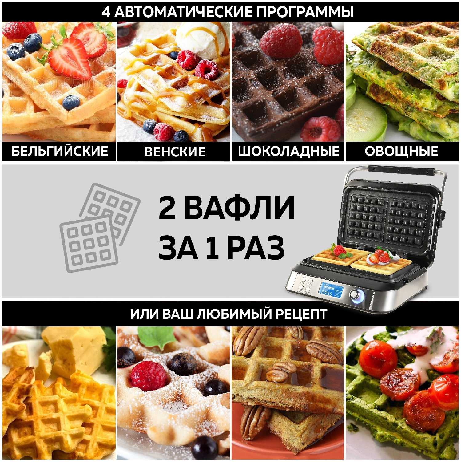 Да, производитель предоставляет книгу рецептов с проверенными вариантами (бельгийские, овощные, сырные вафли). Дополнительные рецепты доступны на официальном сайте и YouTube-канале бренда. Физические аксессуары в комплекте не упоминаются, но их отсутствие компенсируется универсальностью панелей. -