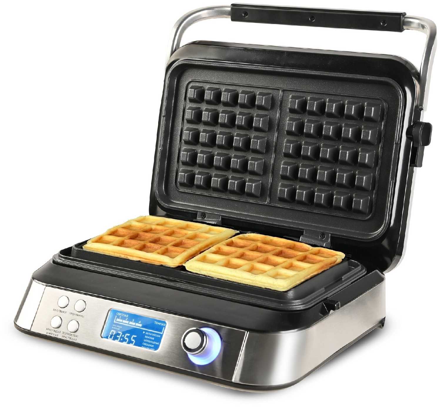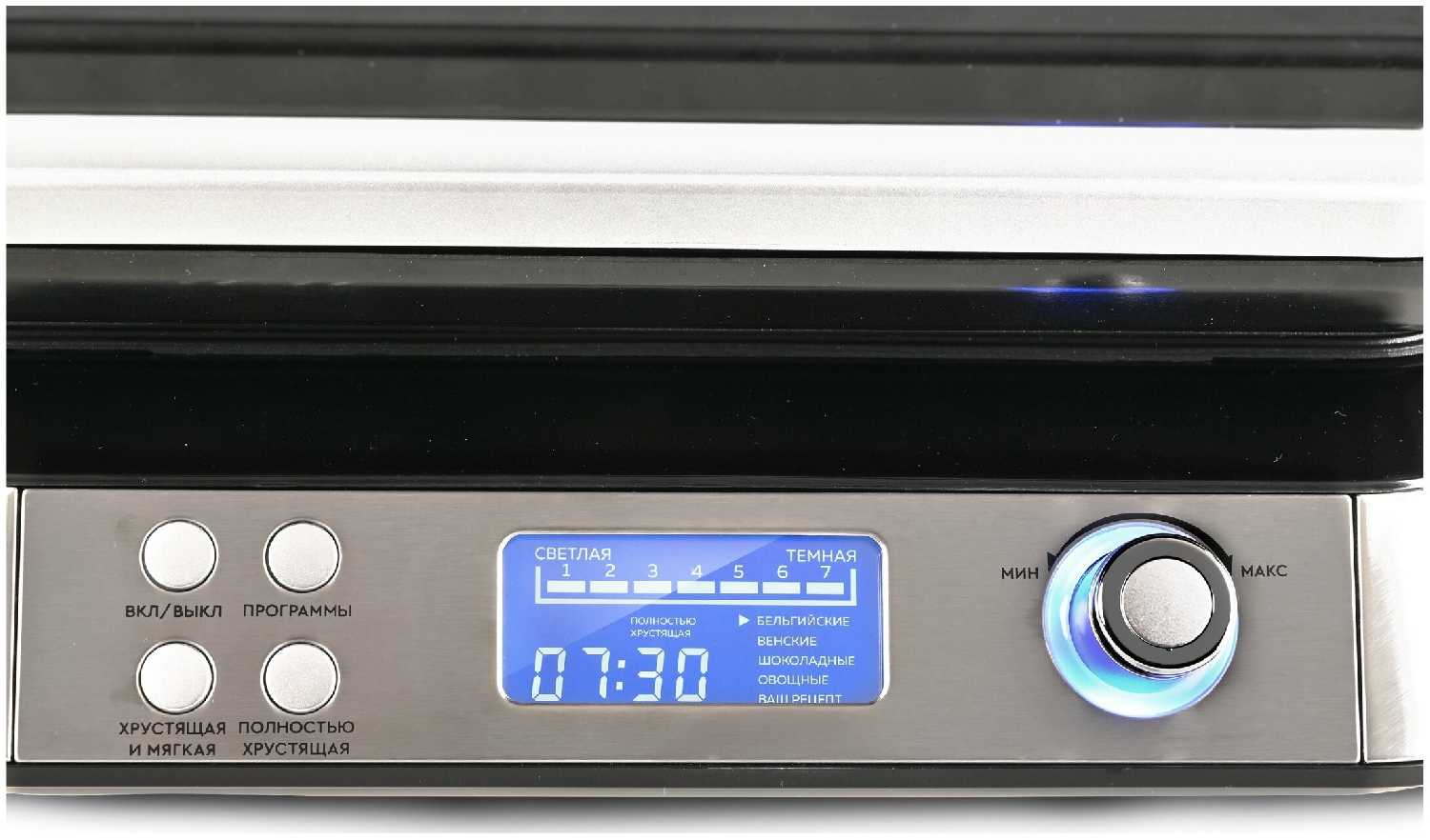 Управление интуитивно понятное: достаточно выбрать тип вафель (4 автоматические программы) и степень прожарки (12 уровней). На дисплее отображается обратный отсчет времени. Пользователи отмечают, что интерфейс проще, чем у аналогов, а предустановленные режимы охватывают большинство рецептов — от классических до овощных вафель. -