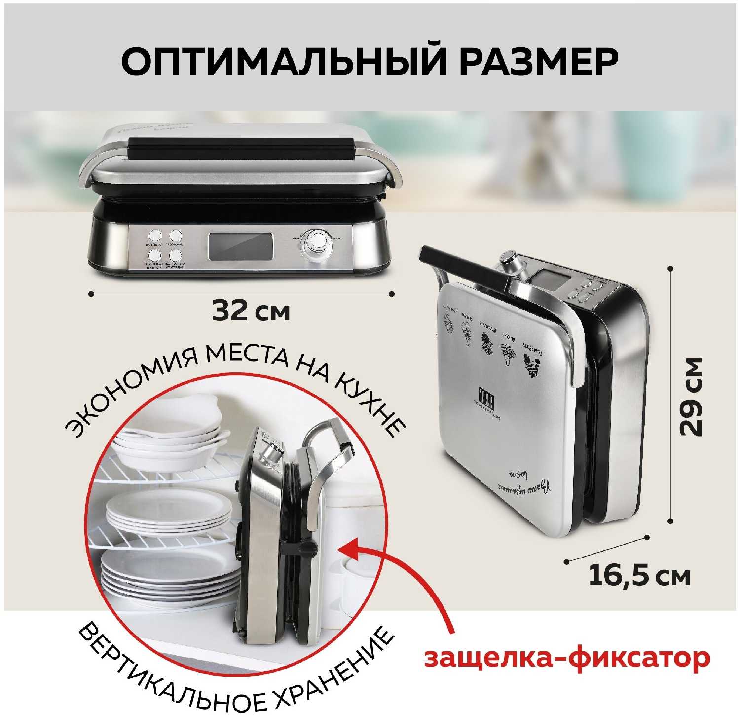Несмотря на заявленный вес 4.5 кг (обусловленный металлическим корпусом), вафельница компактна. При вертикальном хранении занимает минимум места. Пользователи удивлены, что прибор меньше ожидаемого и свободно помещается в стандартные кухонные шкафы. -