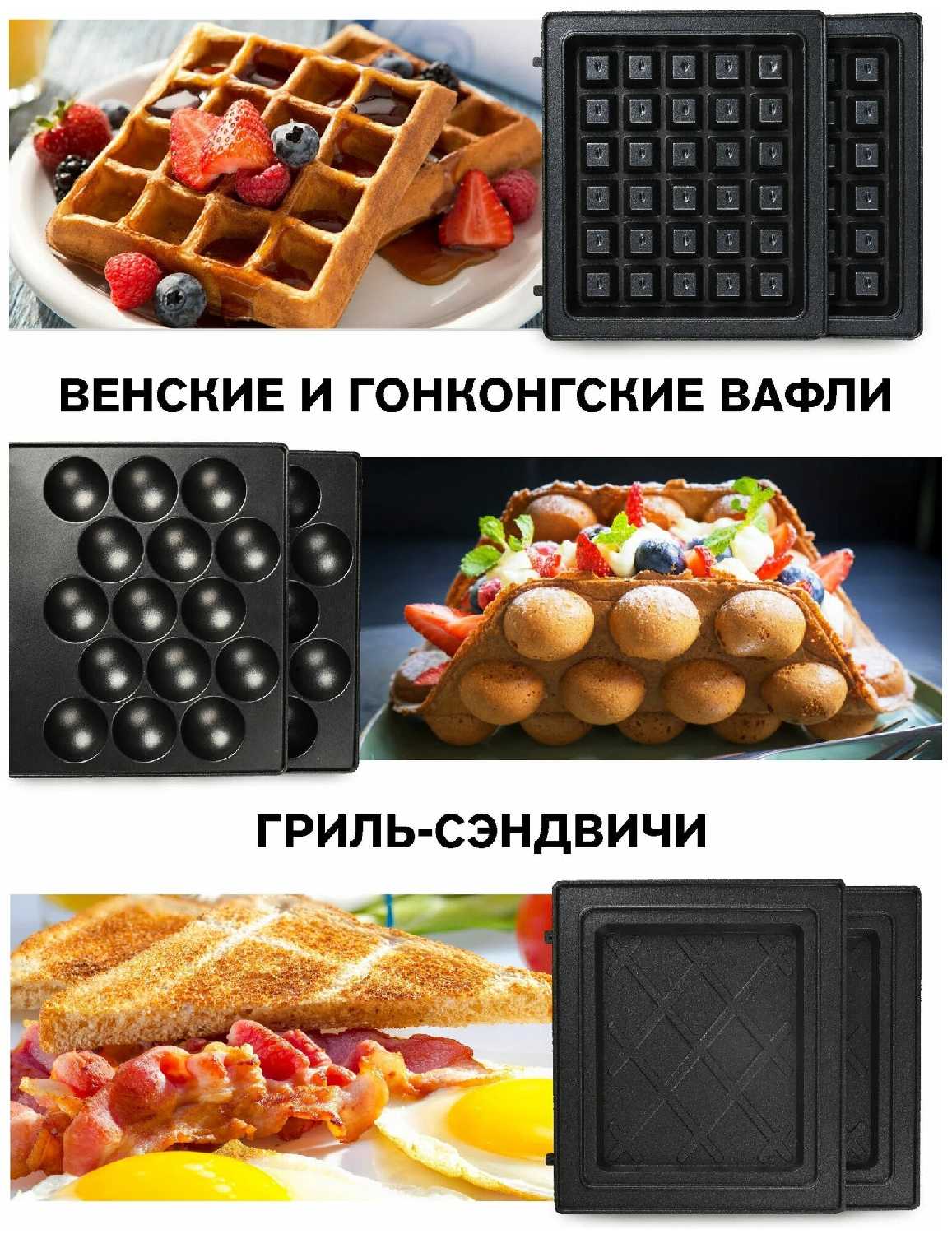 Да, три съемные панели позволяют создавать разнообразные блюда: гонконгские вафли, мини-пончики, сэндвичи, орешки и даже овощные оладьи. Успешно готовят кабачковые вафли, сырные корн-доги и омлеты — тесто приподнимает крышку за счет воздушности. -
