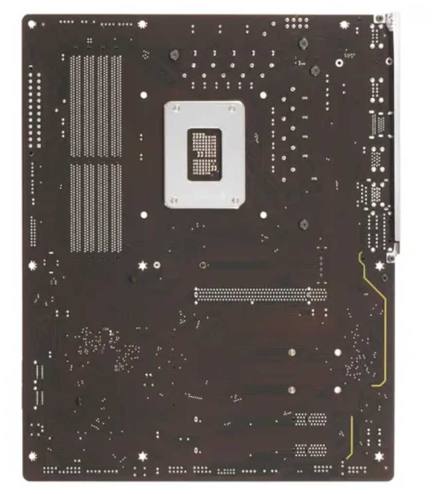 Компоновка разъемов вызывает закономерную критику: все корпусные вентиляторы (SYS_FAN) и разъем помпы (PUMP_FAN) сгруппированы в нижнем правом углу, что усложняет прокладку кабелей. Кнопка Q-Flash Plus расположена удачно, но механизм фиксации PCI-E x16 затрудняет извлечение видеокарт с массивными системами охлаждения. Радиатор верхнего слота M.2 физически конфликтует с GPU — для замены накопителя часто требуется демонтаж видеокарты. На тыльной стороне отсутствует кнопка сброса CMOS, а батарейка CR2032 спрятана под слотом PCI-E x1. Комплектация минималистична: два SATA-кабеля, крепеж M.2 и антенна Wi-Fi (для AX-версий).