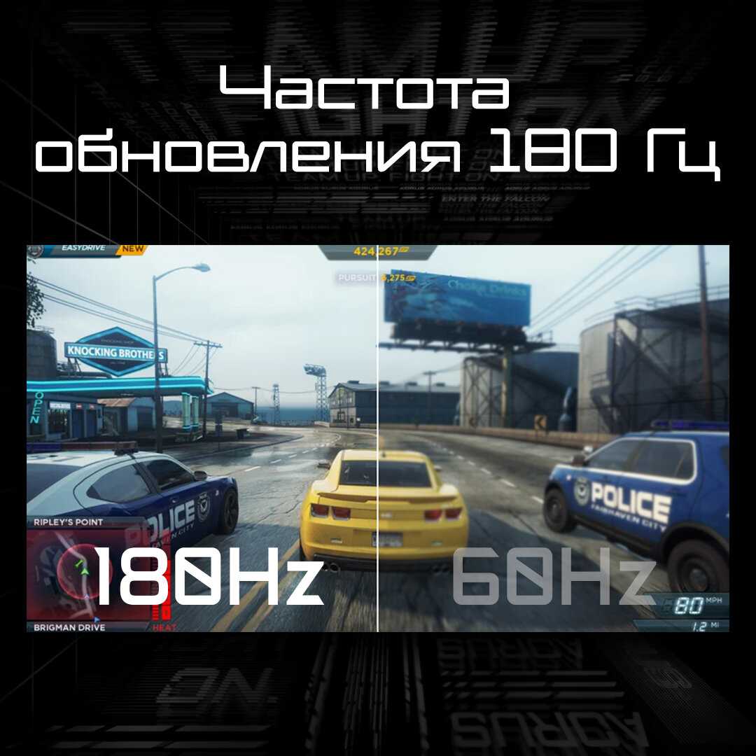 - Поддержка 180 Гц через DisplayPort и до 144 Гц через HDMI обеспечивает заметную плавность по сравнению с 75 Гц мониторами.