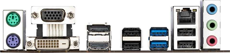| Разъемы на задней панели : | 2 x USB 3.2 Gen1 Type-A, 4 x USB 2.0 Type-A, DVI, DisplayPort, HDMI, LAN RJ-45, PS/2 (клавиатура), PS/2 (клавиатура/мышь), PS/2 (мышь), VGA |