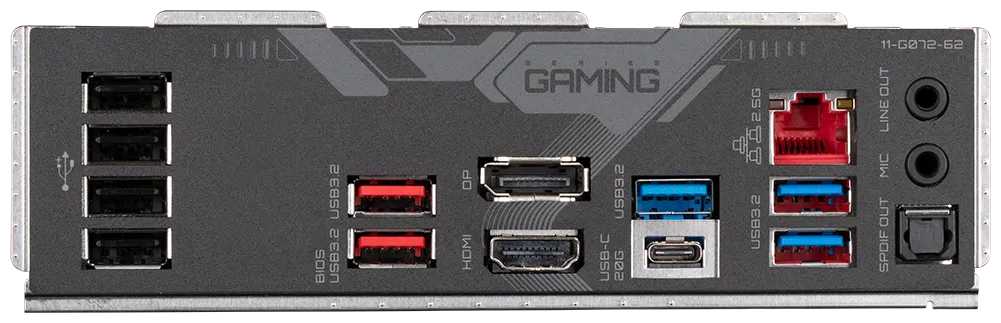 Разъемы на задней панели : | 2 x USB 3.2 Gen2 Type-A, 3 x USB 3.2 Gen1 Type-A, 4 x USB 2.0 Type-A, DisplayPort, HDMI, LAN RJ-45, USB 3.2 Gen2x2 Type-C, выход S/PDIF оптический |