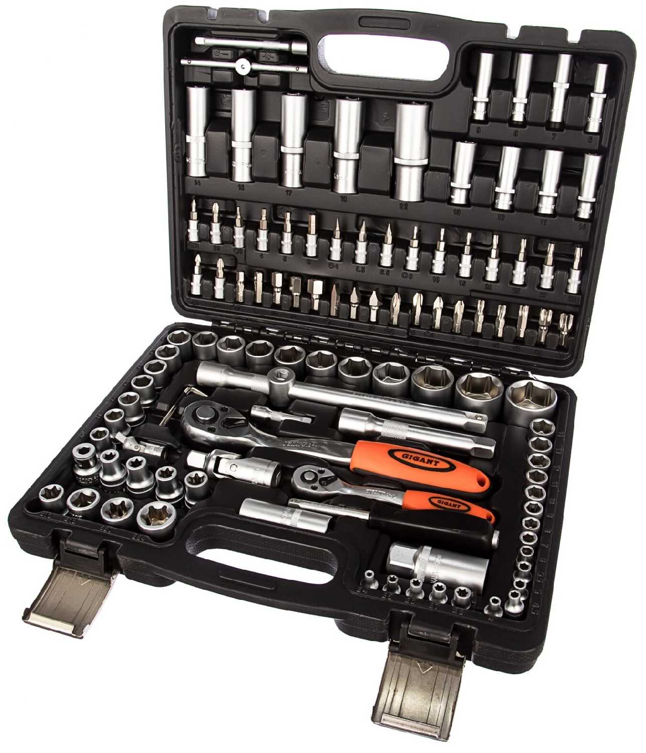 | Ручной инструмент подробно : | трещотка 1/4": 24 зуба, трещотка 1/2": 24 зуба, вороток с рукояткой 6", Т-образный вороток с ползунком |