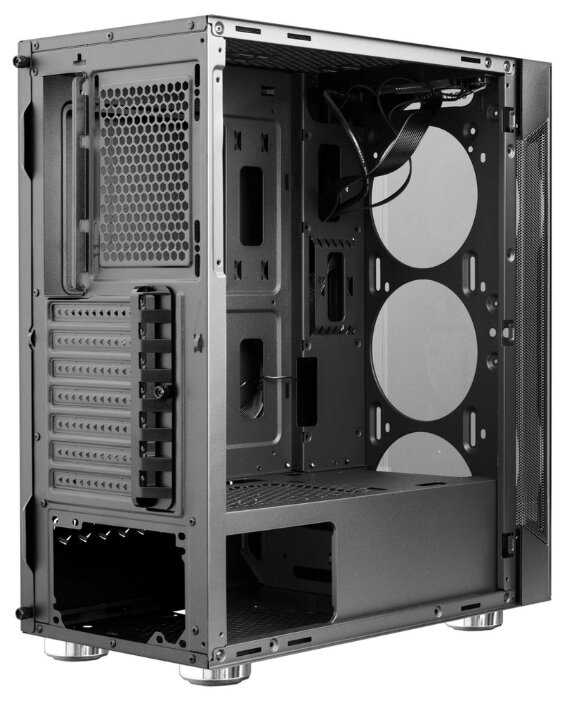 - + Вместительный, продуваемый, нижнее расположение блока питания, закалённое стекло на боковой поверхности и передней панели, пространство под кабель-менеджмент.