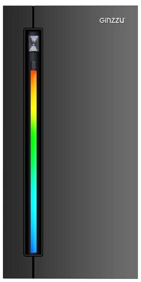 Корпус выполнен полностью в черном цвете, на лицевой стороне вертикально расположилась RGB лента, которая насчитывает 16 режимов работы.
