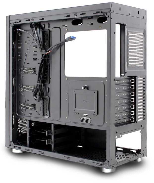 Пространство за материнской платой узкое (до 2 см), что осложняет укладку толстых кабелей в оплётке. Отверстия для прокладки проводов расположены неудобно: центральное слишком большое, а верхнее — единственное для 24-контактного разъёма. Комплектные пластиковые стяжки и заглушки для USB/аудио портов упрощают сборку, но крепления для 2.5" дисков выполнены неудачно — некоторые пользователи фиксировали SSD на двухсторонний скотч. Корзины для 3.5" HDD критикуют за кривые монтажные отверстия и необходимость демонтажа клёпок.
