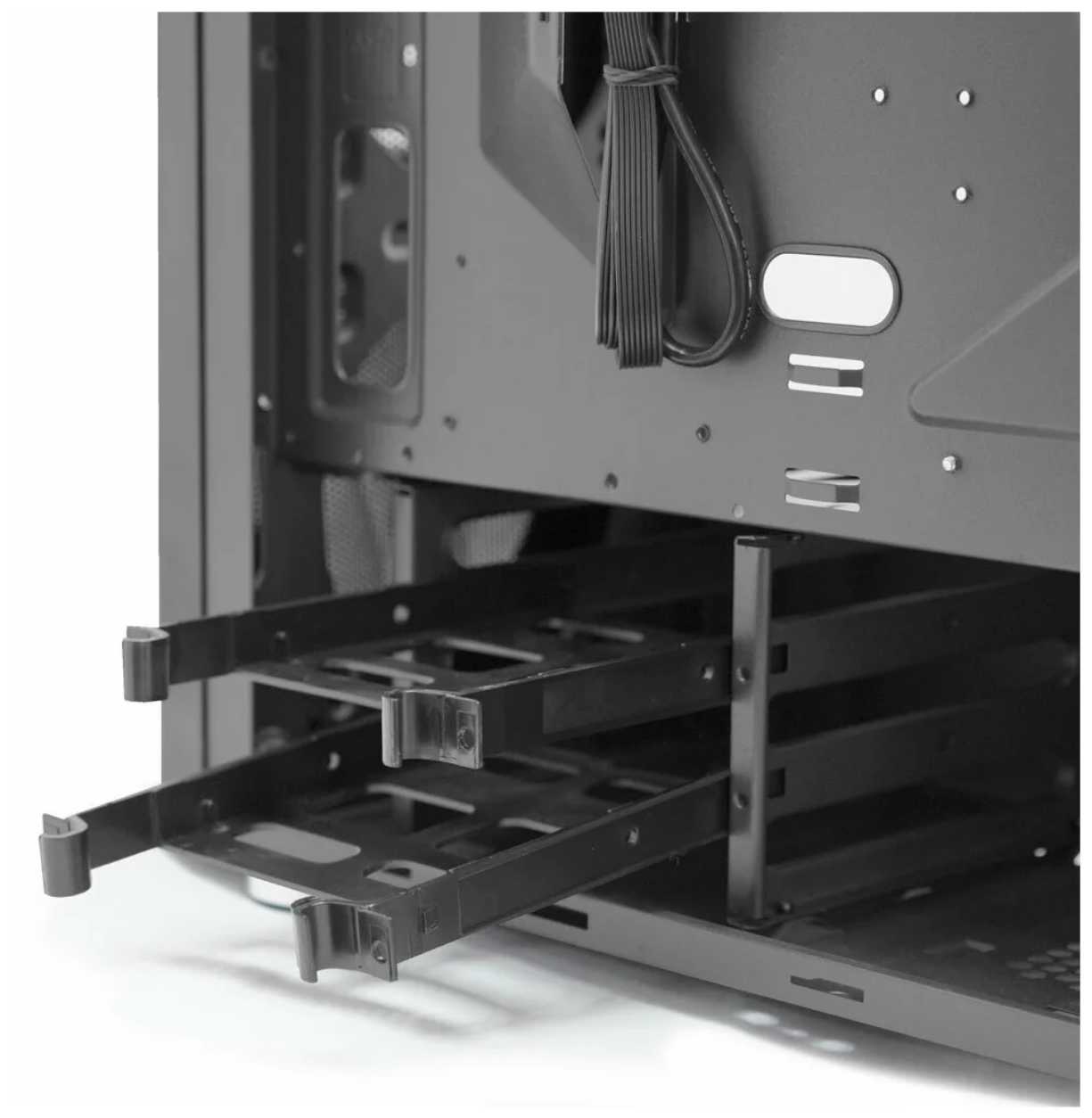 Есть две корзины под 3.5" HDD на быстросъемных пластиковых салазках, позволяющие установить до трех дисков, но с нюансами (криво стоящие заводские отверстия). Места под 2.5" SSD расположены неочевидно: один слот с обратной стороны материнской платы, а крепление на лицевой стороне зависит от размеров платы и видеокарты и осуществляется "на соплях" длинным винтом из комплекта, что пользователи находят странным и неудобным. -