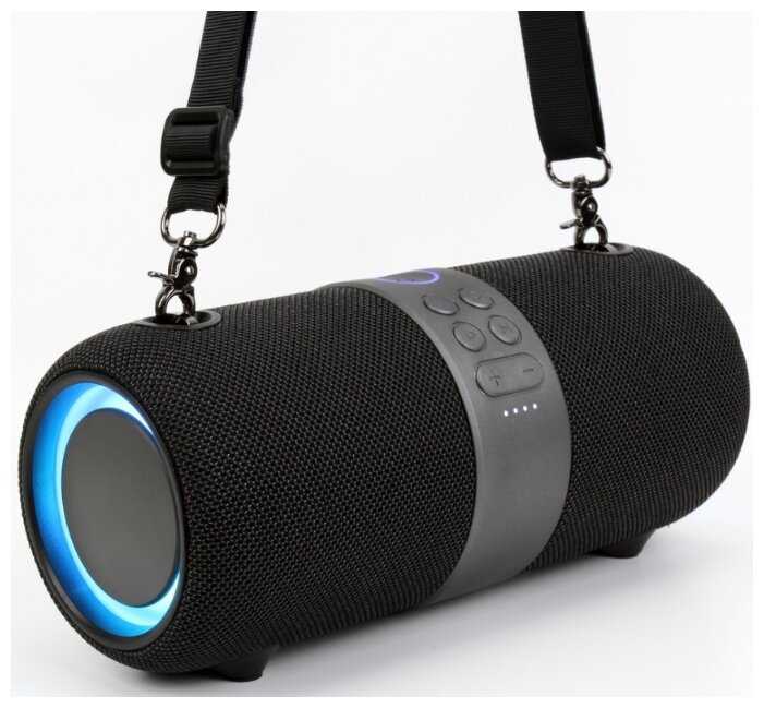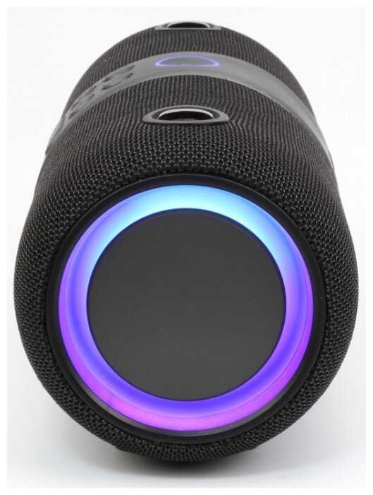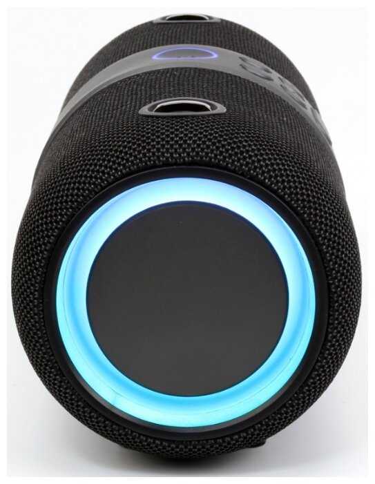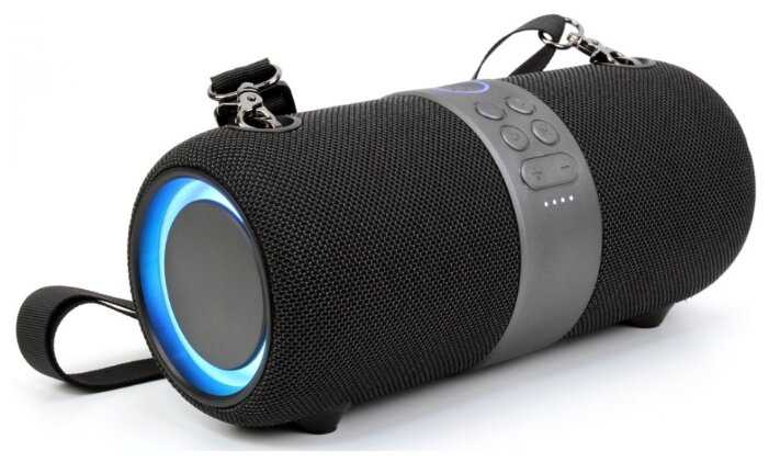 Звук довольно громкий, по бокам RGB-подсветка выглядит очень стильно. В комплекте идет AUX-кабель, ремешок и кабель для зарядки