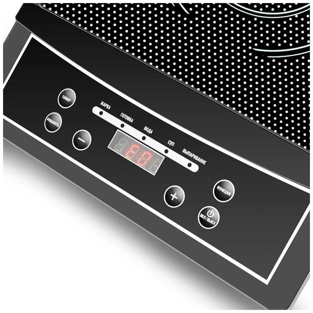 Плитка оснащена полезным набором функций, включая таймер, несколько режимов готовки (включая жарку) и регулировку мощности с шагом 200 Вт. Возможность установки очень низкой мощности (от 120 Вт) позволяет медленно томить блюда, например, холодец. Однако управление вызывает неоднозначные отзывы: кнопки и индикаторы могут выходить из строя ("не все кнопки-лампочки работали"), а после выключения кнопкой плитка сбрасывает настройки и всегда включается на максимальные 2000 Вт, что пользователи находят неудобным. Таймер также иногда работает некорректно. Требуется внимательное изучение инструкции для правильного использования всех режимов.