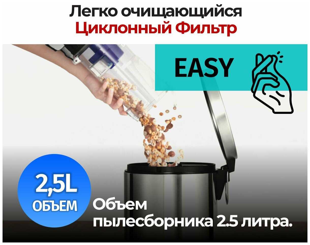 Контейнер для мусора и эргономика: Несмотря на заявленный объем (около 2.3 л), реальная полезная емкость контейнера оценивается как недостаточная (менее литра), особенно при уборке квартир от 60-80 кв.м или при наличии животных. Шерсть быстро заполняет объем. Процесс его очистки описывается как "квест" из-за неудобной конструкции: узкое горлышко и внутренние элементы (фильтр, перегородки) мешают эффективно вытряхнуть мусор и вымыть емкость, до некоторых участков сложно дотянуться рукой. Дополнительные минусы эргономики: плохая фиксация шланга у основания (он постоянно слетает), недостаточная маневренность из-за прорезиненных колес, непривычное для некоторых расположение регулятора мощности на корпусе (не на рукоятке).