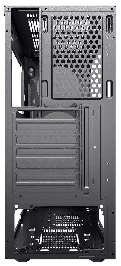 - Конструкция с возможностью установки до 6 вентиляторов (3 спереди, 1 сзади, 2 сверху) обеспечивает стабильное охлаждение даже для производительных компонентов.