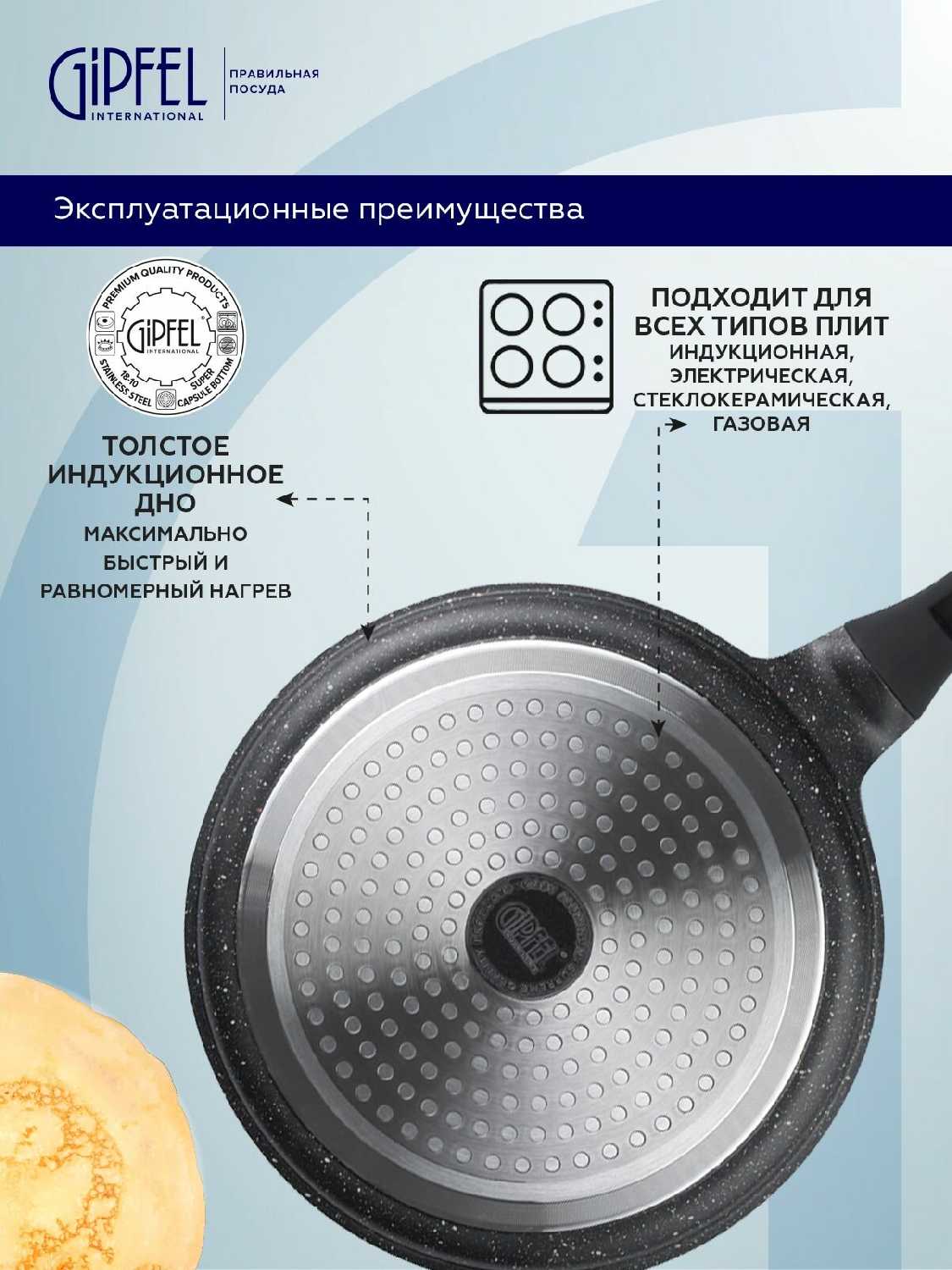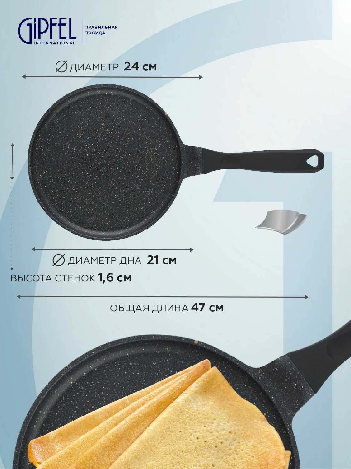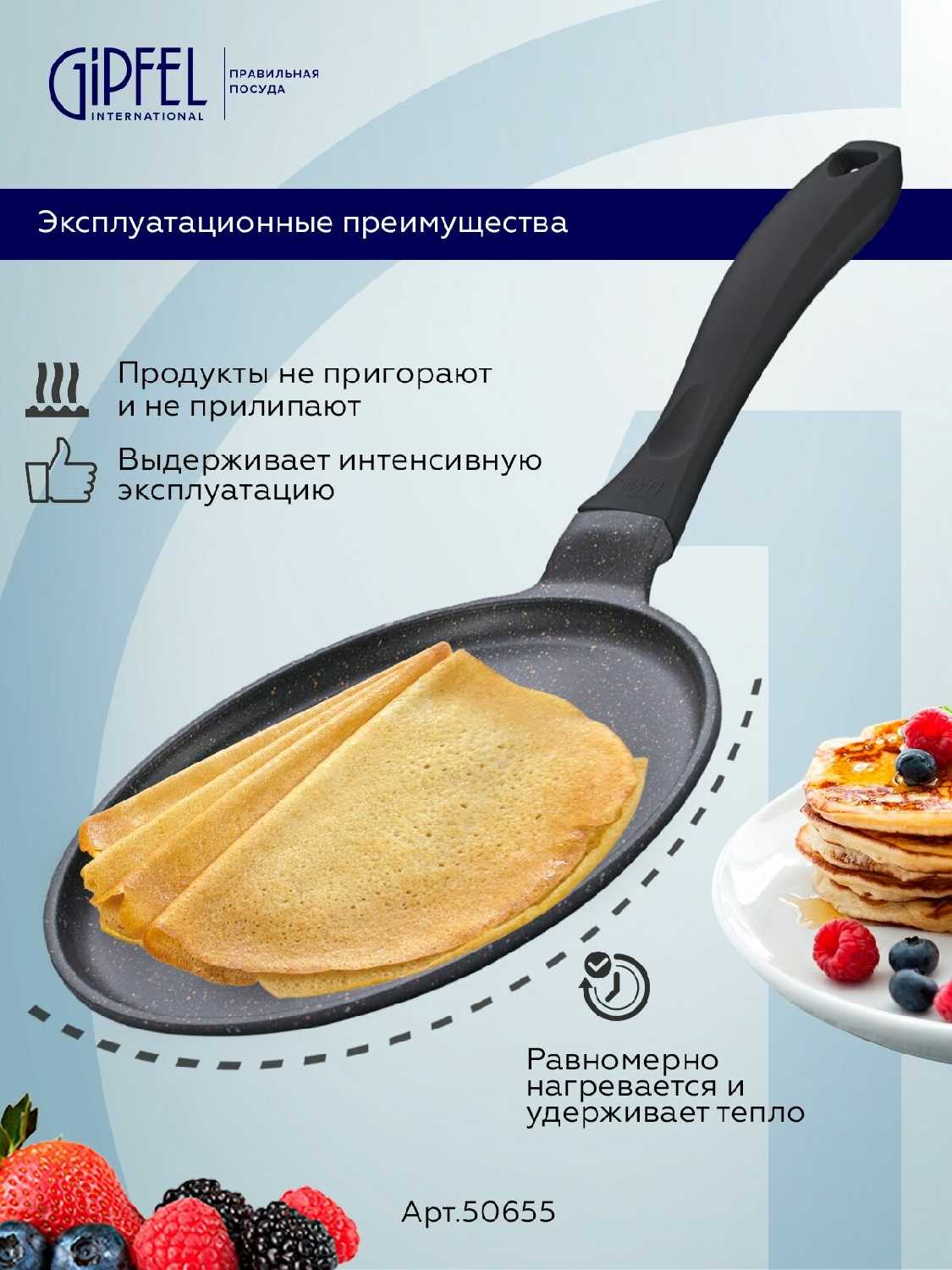 - + Быстро и равномерно нагревается. Блины не пригорают.