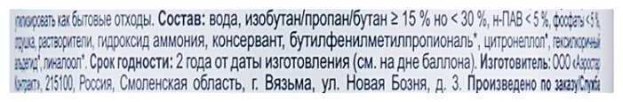 | Состав : | вода, бутан/пропан/изобутан менее 15% но более 30%, н-ПАВ <5%, фосфонаты <5%, отдушка, растворитель, водный раствор аммиака, консервант, линалоол |