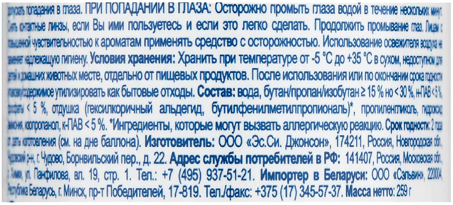 | Состав : | вода, бутан/пропан/изобутан ⩾ 15% но < 30%, н-ПАВ < 5%, фосфаты < 5%, отдушка (d-лимонен, цитраль, линалоол), пропиленгликоль, гидроксид аммония, изопропанол, к-ПАВ < 5% |