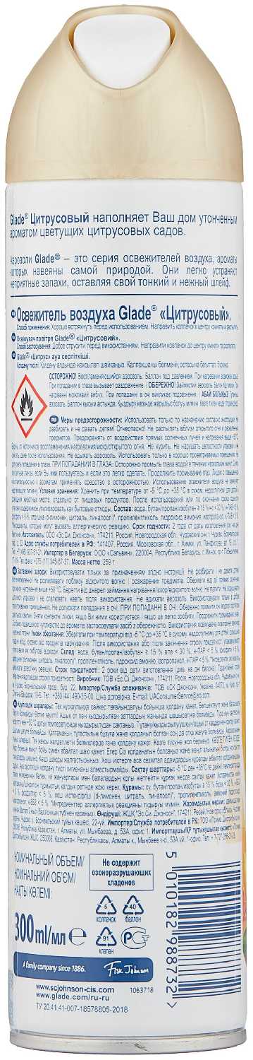 Состав : | вода, бутан/пропан/изобутан ⩾ 15% но < 30%, н-ПАВ < 5%, фосфаты < 5%, отдушка (d-лимонен, цитраль, линалоол), пропиленгликоль, гидроксид аммония, изопропанол, к-ПАВ < 5% |