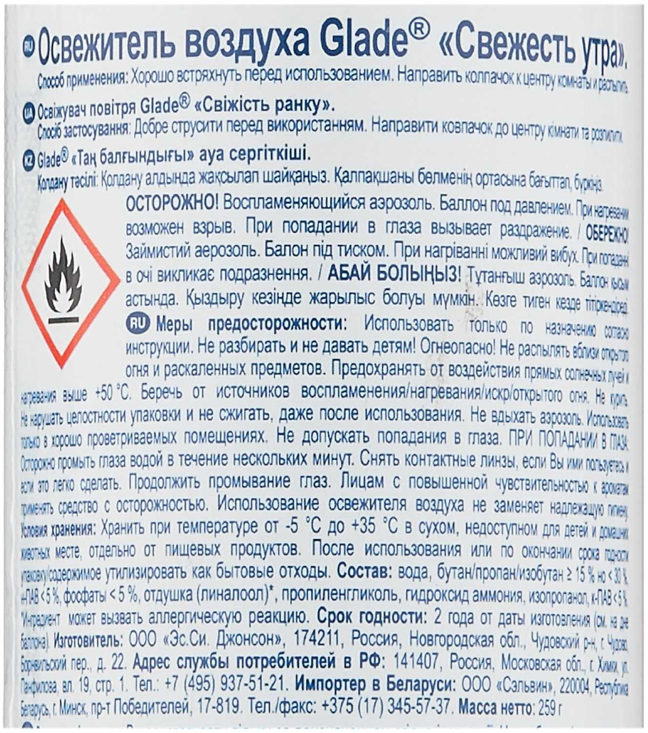 Характеристи Glade освежитель воздуха Свежесть утра, 300 мл