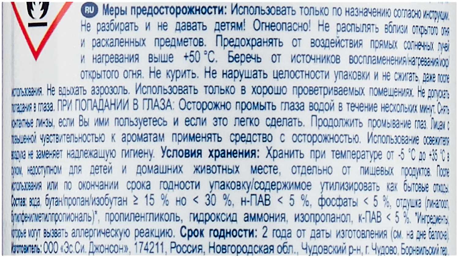 | Состав : | вода, бутан/пропан/изобутан ⩾ 15% но < 30%, н-ПАВ < 5%, фосфаты < 5%, отдушка (d-лимонен, бутилфенилметилпропиональ), пропиленгликоль, гидроксид аммония, изопропанол, к-ПАВ < 5% |