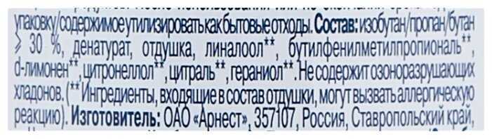 | Состав : | изобутан/пропан/бутан ⩾ 30% денатурат отдушка линалоол** бутилфенилметилпропиональ** d-лимонен** цитронеллол** цитраль** гераниол**, **ингредиенты входящие в состав отдушки могут вызвать аллергическую реакцию |