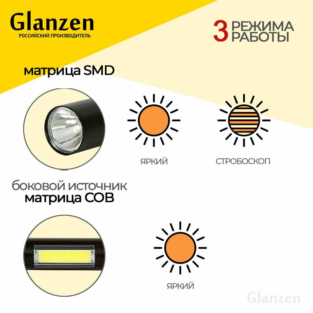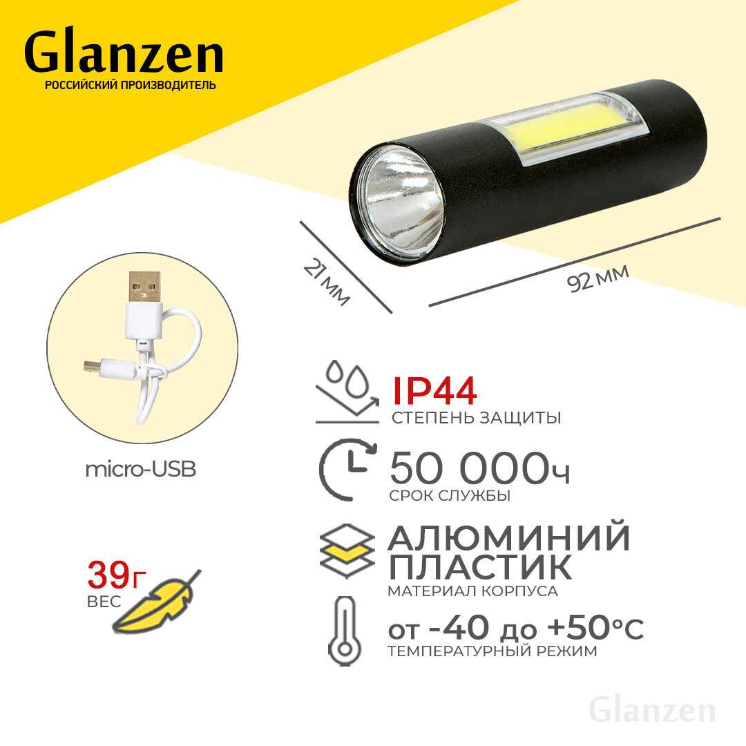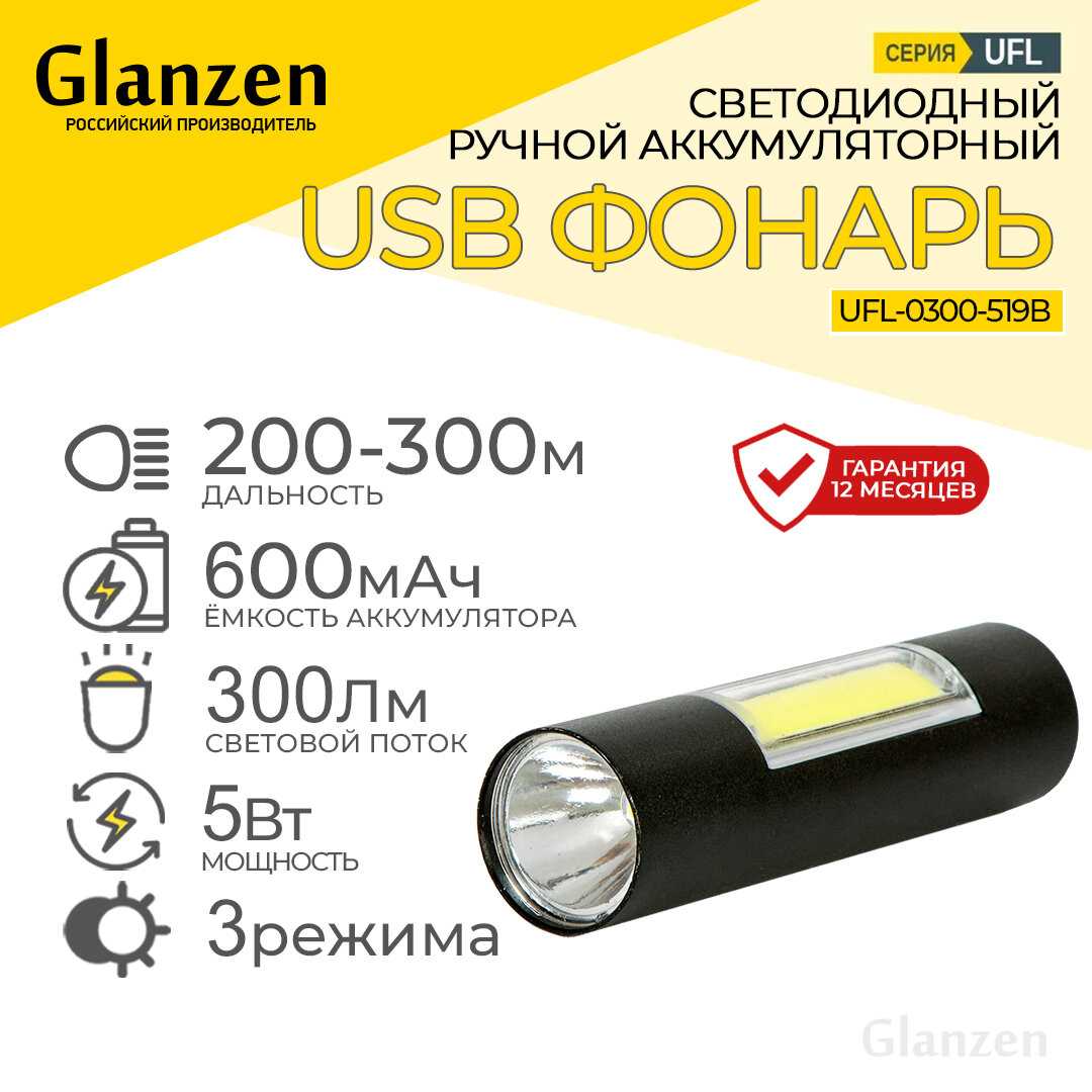 Отзывы о Светодиодный аккумуляторный USB фонарь GLANZEN Фонарь (UFL-0300-519B)