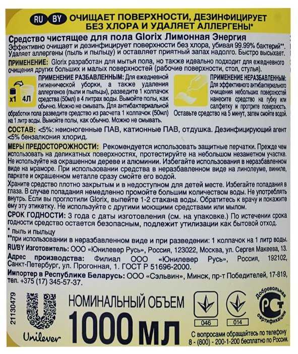 | Способ применения : | добавьте 1 колпачок чистящего средства с дезинфицирующим эффектом Glorix (50 мл) в полведра (4 литра) воды. Погрузите половую тряпку в раствор Glorix, и отожмите излишки раствора. С тряпки не должна стекать вода. Вымойте полы как обычно. Подходит для плиточного, линолеумного и каменного пола. Не требует смывания |