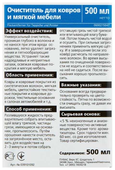 | Подробная комплектация : | Очиститель для ковров и мягкой мебели, Pufas Glutoclean Flecken Entferner, 500 мл. - 1 шт |