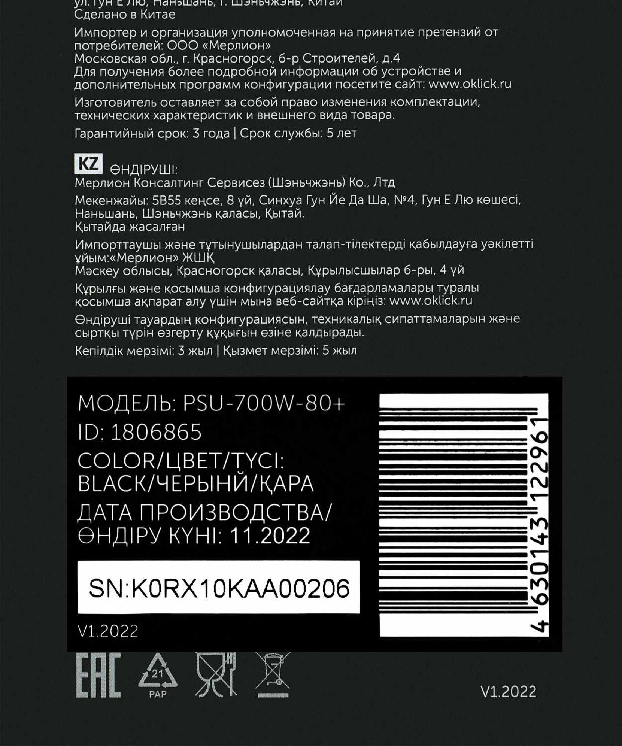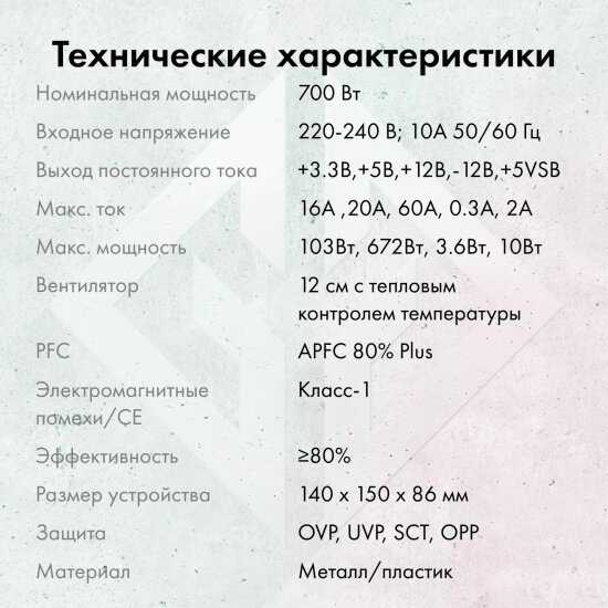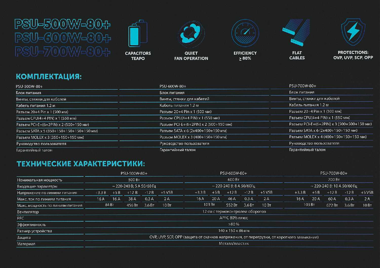- + 80 процентов эффективность, 700 вт мощность, металлический корпус, кабели чёрного цвета.