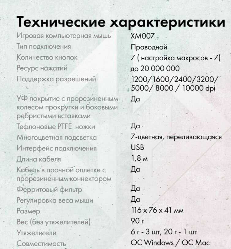 - + Стиль, плетённый кабель, 10000 дпи, 7 макросов, регулируется вес.
