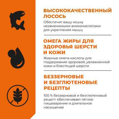 | Особые потребности : | беззерновой, гипоаллергенный, для беременных / кормящих кошек, для живущих в помещении, для здоровья кожи и блеска шерсти, для стерилизованных/кастрированных, при чувствительном пищеварении |